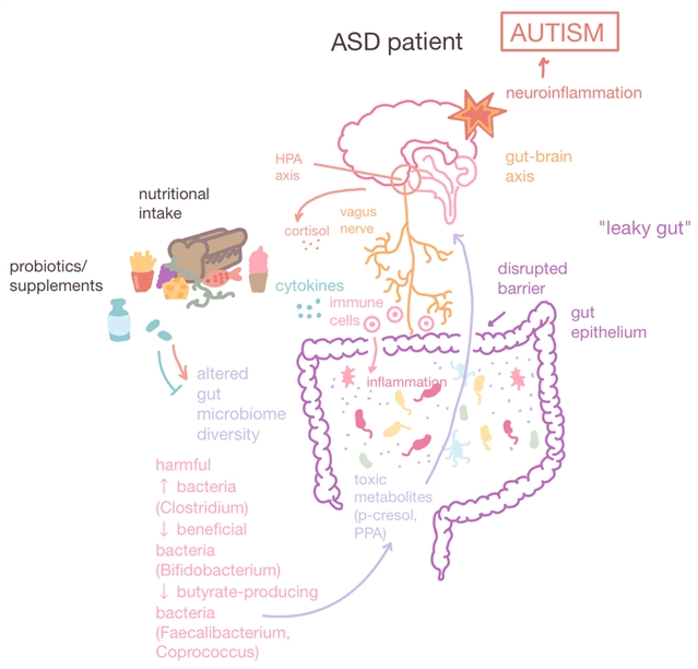 图片:肠–脑轴与自闭症谱系障碍(ASD)患者肠道菌群变化。肠–脑轴是由迷走神经介导的大脑与胃肠道之间的双向联系。ASD患者的肠道菌群组成发生改变,表现为菌群多样性下降,有害菌(如产有毒代谢物PPA的梭菌)增加,而有益菌(如双歧杆菌)及产丁酸菌(如粪杆菌属和球状芽胞杆菌属)减少,这些菌群在维持肠道屏障完整性方面起关键作用。肠漏或肠道菌群失调是一种肠道通透性增加的状态,会引发胃肠道炎症。此外,肠漏可导致更多有毒代谢物通过肠道进入血液循环,潜在穿过血–脑屏障,引起神经炎症。饮食干预和益生菌可调节肠道菌群组成,减轻胃肠道炎症,并改善ASD的行为症状。上箭头:增加;下箭头:减少。