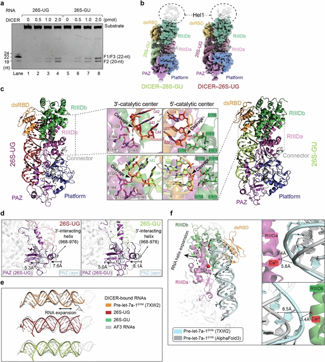 Abstract: RNA interference (RNAi) depends on DICER, an essential enzyme that processes RNA precursors into small regulatory RNAs. DICER cleaves RNA precursors according to the 5′-end counting rule, in which RNA length is measured from the 5′-end1,2,3. Previous work proposed a single 5′-end binding pocket that disfavours guanosine (5′-G), leading to cleavage inaccuracies4. Here we show that 5′-G promotes precise cleavage for many substrates. Using massively parallel dicing assays and cryo-electron microscopy, we identify a conserved guanosine-favoured (G-favoured) binding pocket in DICER, distinct from the previously described uridine-favoured (U-favoured) pocket. Together, these pockets influence the alignment between 21-nucleotide and 22-nucleotide cleavage registers, expanding the mechanism of small-RNA biogenesis in metazoan DICERs. We also find that conflicts between 5′-end binding and RNA-motif recognition can trigger RNA conformational adjustments that preserve accurate cleavage-site selection. In addition, conformational adjustments of the double-stranded RNA-binding domain (dsRBD) and PAZ domain help to align substrates with the catalytic centres for precise double-strand cleavage. These results show that the DICER cleavage mechanism integrates dual 5′-end binding pockets, RNA-motif influence and domain motions, advancing our understanding of microRNA biogenesis.