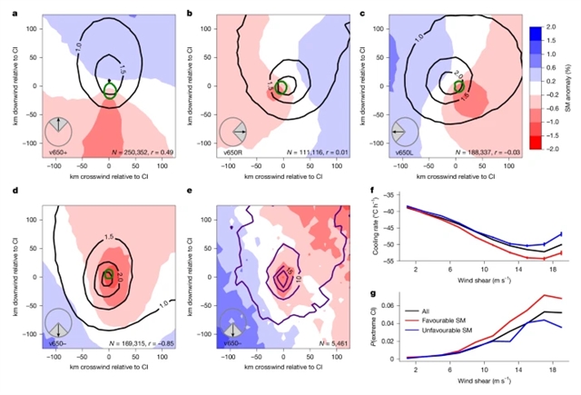 研究组表明,SM差异与风切变的协同作用尤其有利于极端风暴的激发。通过对撒哈拉以南非洲地区220万次午后事件的分析,研究组发现,在土壤条件有利(相对于不利)的情况下,被归类为极端的起始事件数多出68%,在SM驱动的气流循环与风切变诱导的云层移动方向相反的地方,风暴垂直发展最为强烈。