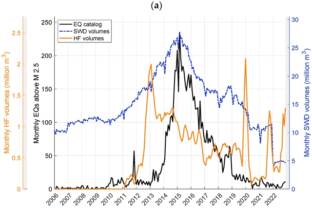 图1.(a)图1a区域内震级大于2.5的去簇地震活动率以及月度水力压裂(HF)和土壤水力钻探(SWD)量的时间序列。2012年之前的HF数据不完整,2012年之前的震级小于3的地震活动数据不完整,2022年的SWD数据不完整。(b)去簇地震活动(震级≥2.5;黑点)、井(黄色:HF;蓝色:SWD)和县/州边界地图。数据时间范围为2006年至2022年9月。