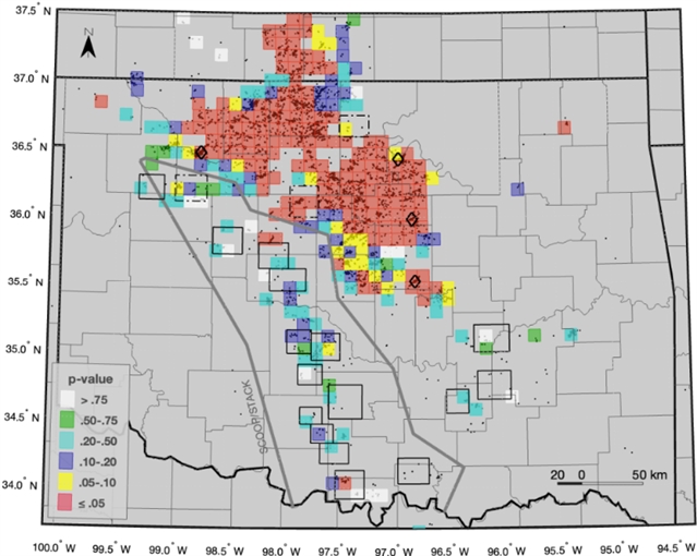 本研究采用基于物理机制的统计假设检验框架,对俄克拉荷马州及堪萨斯州2000年至2023年的地震活动与石油天然气作业数据进行系统分析。研究首先整合了多源地震目录,构建了统一的地震目录,并通过去丛集处理区分主震与余震。针对废水处理与水力压裂两种人为活动,研究分别建立零假设(地震仅由构造加载引起)与备择假设(地震与注水活动相关),并利用广义地震指数模型预测地震活动率。该模型考虑了注入体积、孔隙压力扩散以及地震响应的时间滞后效应。通过将实际观测数据与随机重排生成的合成数据集进行比较,研究为每个空间网格单元计算了表征因果关联置信度的p值。p值低于0.05表明可以在95%的置信水平上拒绝零假设,即该区域的地震活动与特定石油天然气作业存在显著关联。 研究结果显示,废水处理是区域地震活动的主要触发因素。46%的“活跃”网格单元显示出与废水处理高度相关(p_SWD ≤ 0.05),该区域61%的M≥2.5地震事件发生于这些高置信度关联区内,其中包括所有4次M≥5.0大震。研究还发现,地震活动率与最大震级仅与经孔隙压力扩散模型处理后的废水体积呈正相关,而非直接注入体积,凸显了考虑流体扩散过程的重要性。研究未在中部与北部堪萨斯州发现持续性诱发地震活动的证据,尽管该区域存在高容量废水处理作业,表明地质力学条件对诱发地震的敏感性起主导作用。