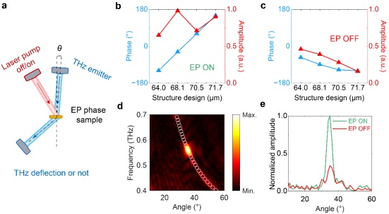 利用一束980 nm的连续激光照射硅基超构表面。激光能量在硅中产生光生载流子,显著增加了材料的电导率,从而引入了额外的光学损耗。这种可控的损耗打破了形成EP所需的条件,相当于一个“关闭”EP的开关。实验显示,随着泵浦光功率从0 mW增加到500 mW,EP点处的尖锐透射谱逐渐变宽、强度减弱,透射率的调制深度高达52%,调制效果高于单独BIC的情况(图3);利用 EP -BIC奇点的拓扑相位特性,在光控条件下实验实现太赫兹波束偏转的动态开关(图4)。尽管当前器件的切换速度受限于硅的载流子寿命(约25微秒),但通过材料工程(如离子注入或使用其他半导体材料)有望将速度提升至亚纳秒甚至皮秒量级。