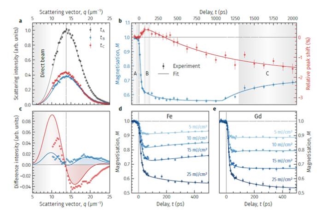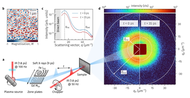 研究团队以Fe/Gd多层膜为模型系统开展实验,该样品中交替的铁磁Fe层和Gd层存在反铁磁耦合,室温下形成迷宫状磁条畴,面外磁化强度交替上下,空间周期约465 nm(图1b)。团队在Gd M5、Fe L3吸收边开展时间分辨SAXS测量,通过方位角积分提取散射强度I (q,t)和主峰位置q1st,分别表征磁畴的磁化强度和平均周期性(图1c-d)。