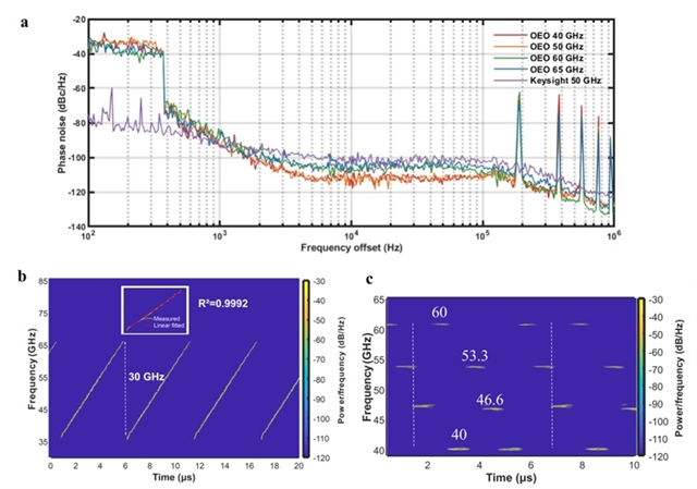 图3.基于TFLN芯片的FDML OEO系统性能测试结果。(a)40-65 GHz频段下与商用微波源的相位噪声对比;(b)LCMW信号的时频图;(c)4-FSK信号的时频图