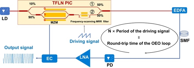 光电振荡器(OEO)通常利用低损耗长光纤或高Q光学谐振腔存储能量,能够生成高频且相位噪声较低的信号。然而,由于光路回路较长,其模式建立时间也相应延长,导致信号扫描速率受限。为生成快速频率可调的LCMW信号,必须突破模式建立时间的制约。傅里叶域锁模光电振荡器(FDML OEO)引入了傅里叶域锁模机制,通过快速频率扫描滤波器的设计,并采用与回路振荡信号往返时间同步的周期性驱动信号调谐微环,可同时激发大量纵模并维持其固定的相位关系。该机制能够直接产生稳定的周期性啁啾振荡,从而实现信号的快速频率调谐。尽管目前在硅基或氮化硅-铌酸锂平台上已实现FDML OEO,但其扫频滤波器普遍基于热光效应构建,存在调谐速度慢、频率响应非线性等问题,限制了LCMW信号的扫描带宽、啁啾率与线性度。相比之下,TFLN超快线性的电光效应可用于构建线性超快频率扫描滤波器,为FDML OEO生成高性能LCMW信号提供了全新的解决方案。