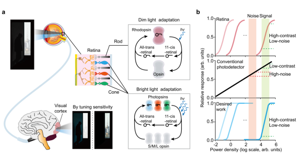 在人类视觉系统中,光适应机制使眼睛能够在强光与微光之间自由切换,始终保持清晰视力(图1)。视锥细胞和视杆细胞会根据环境亮度自动调节敏感度,而感光蛋白的动态合成与分解进一步扩大了视觉系统的适应范围,使人眼可覆盖高达 160 dB 的全局动态范围,并在局部条件下保持 40 dB 的细节分辨能力。这种以“相对光强差异”为核心的自适应策略,不仅让眼睛能够轻松识别低对比度目标,也能有效屏蔽无关噪声。