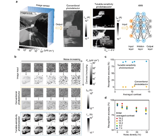 智能机器视觉要求光电传感器必须能够对极其微弱的光强变化产生清晰、可区分的电学响应,以确保目标特征被准确捕获。然而,传统光电探测器普遍存在光响应较弱、光电流与光强呈近似线性关系等问题,难以有效放大低对比度信号中的关键差异,同时易受背景光噪声干扰,限制了其在复杂环境中的识别能力。