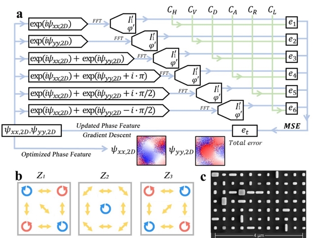 图2:基于超表面的三维涡旋光阵列算法流程框架、三维衍射级次偏振态分布及扫描电镜图