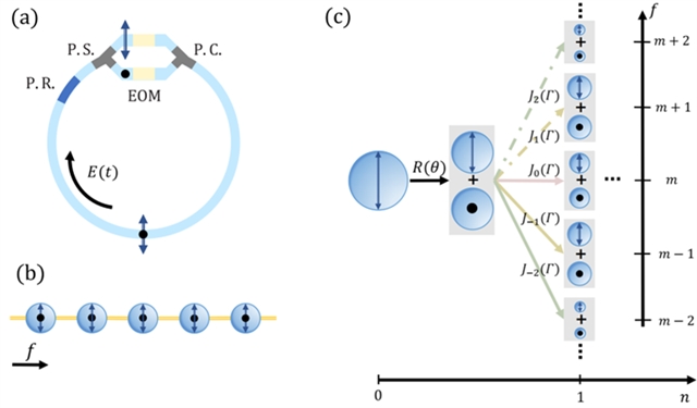 图1:a环形谐振腔的结构说明;b频率维度中的一维合成自旋晶格;c合成频率维度中的一维离散时间量子行走示意图