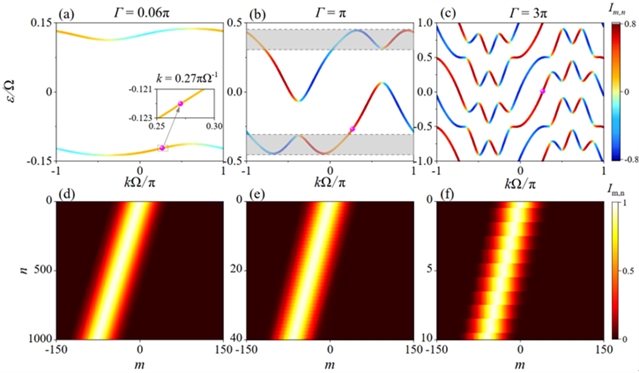 该离散量子行走系统的能带为如图2 a-c所示的拓扑能带,在特定的激发能量下表现出自旋-动量锁定。对单条能带上某一准动量所对应的本征态在模拟中进行激发,能够看到被激发的本征态发生单向的频率转化(图2 d-e)。