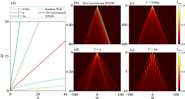 图3:a扩散经典随机行走、一维传统离散时间量子行走和三种不同调制强度下的频率维度中的一维离散时间量子行走各自的扩散距离随行走步数的变化;b-e模拟中一维传统离散时间量子行走和频率维度中的离散时间量子行走的演化过程