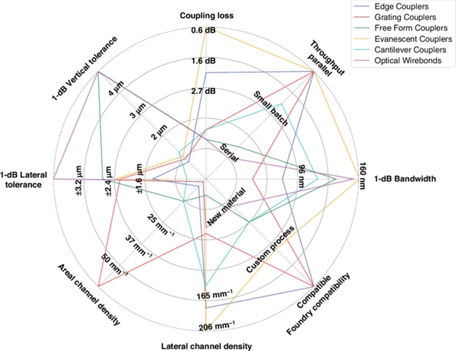 图1:不同类型波导-波导耦合方案在多项性能指标方面的对比图。