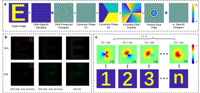 图2. 算符选择性全息图。a. 在OAM通道中叠加修正相位,b. 仅有特定的算符路径可以重建目标图像。c. 同一整数OAM通道可细分为多个算符子通道,作为独立的信息载体。