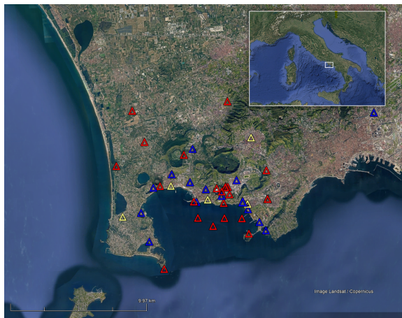 图1.红色三角形代表永久地震台网的INGV-OV地震台站,蓝色三角形代表RAN加速度计,黄色三角形代表INGV临时安装的加速度计,这些加速度计将地震台网与专有数据记录器和高质量MEMS加速度计集成在一起