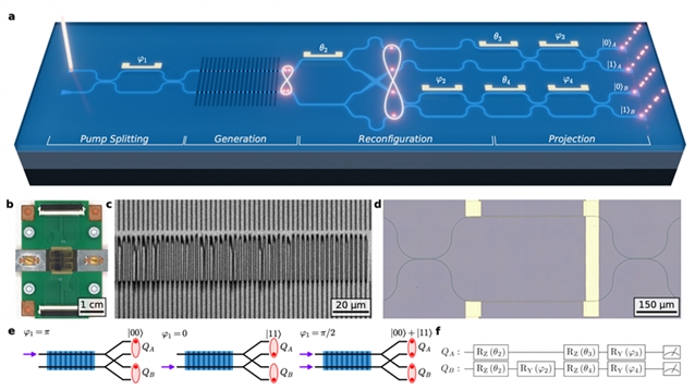 在该研究中,研究团队在薄膜铌酸锂平台上构建了一套高度可编程的量子光子集成电路,并首次将双光子纠缠态的生成、干涉调控以及量子态层析测量等功能全部集成在同一片芯片上。