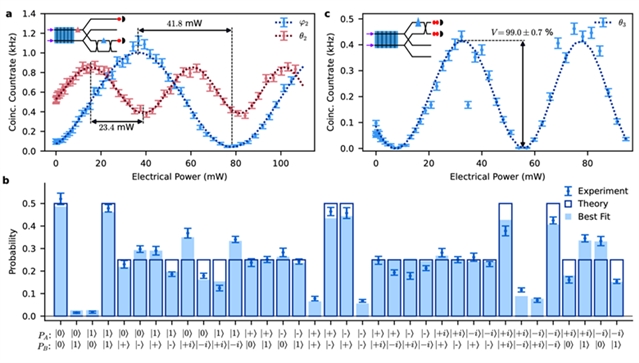 图2:片上干涉性质表征和投影测量。(a) 重构相位φ2和θ2的热光移相器的校准测量。虚线为校准拟合曲线。插图为简化的电路示意图。(b) 用于Bell态量子态层析的过完备投影集。实验测得的概率与理论预期结果以及使用全局最小化算法获得的最佳拟合结果进行比较。(c) 使用来自独立光源的光子对进行双光子干涉测量,可见度 V 为 99.0 ± 0.7%。