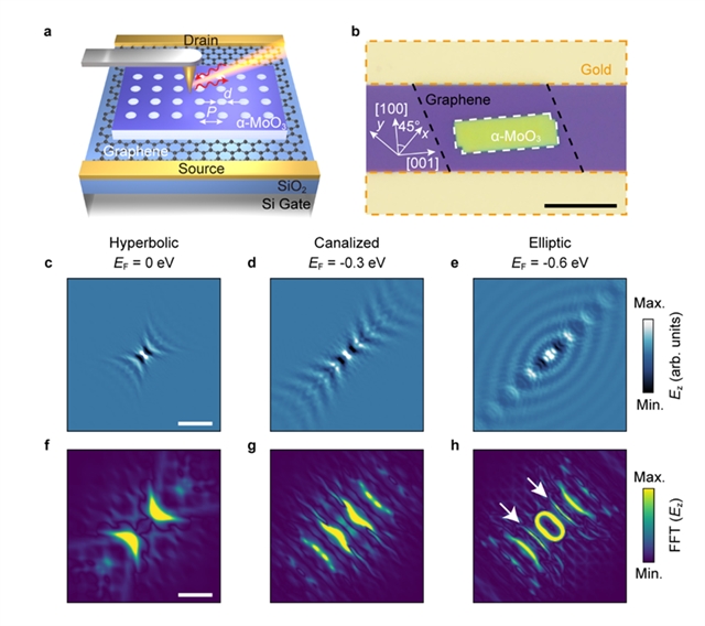 为解决以上难题,来自同济大学、中南大学、美国纽约市立大学和韩国浦项科技大学的国际科研团队,设计了一种α-MoO3极化激元晶体/石墨烯异质结。该结构将α-MoO3的低损耗、各向异性特性与石墨烯的电学调控能力相结合。具体而言,团队在α-MoO3薄层上制备了周期性的纳米孔阵列以构成极化激元晶体,再将其与单层石墨烯进行堆叠。通过施加背栅电压改变石墨烯的费米能级,即可有效调控整个异质结构的光学响应,为实现纳米尺度的光子动态操控提供了一个新平台。
