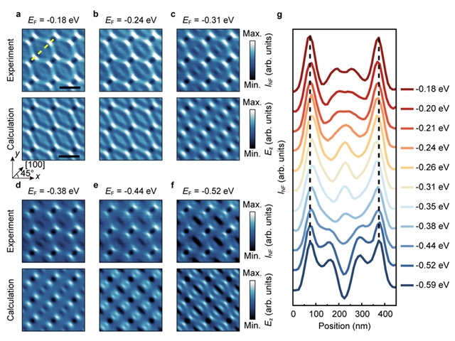通过红外散射式扫描近场光学显微镜,研究团队在纳米尺度下直接观测布洛赫模式随电压变化的动态过程(图1、图2)。随着石墨烯费米面不断上升,极化激元布洛赫模式的干涉条纹会发生连续的重构。这直接证实通过电学手段就能在纳米尺度下动态调控中远红外光的布洛赫模式,包括其强度、波长和空间分布。实验测量结果与理论预测高度吻合。