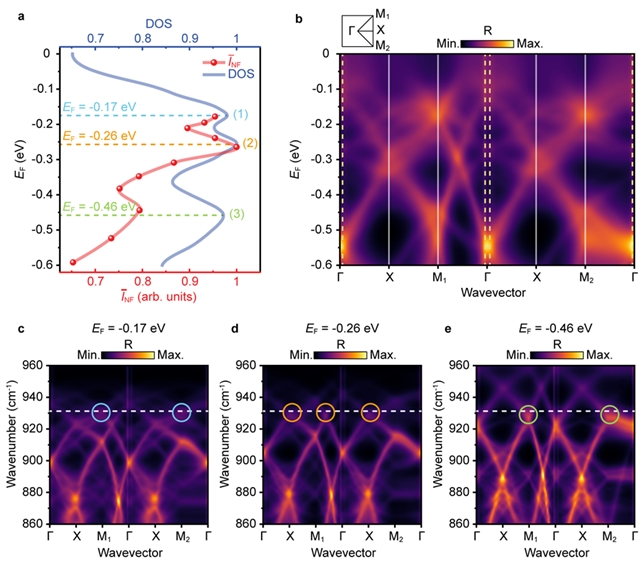 电学调控能够使能带中特定的“平带”区域(此处态密度极高)与固定的激光激发频率精准对齐(图3)。这种对齐能显著增强光与物质的相互作用,导致近场信号产生共振峰。通过电学调控,研究人员可以选择性地让不同的平带区域在所需波长处发挥作用,从而实现按需的信号增强。
