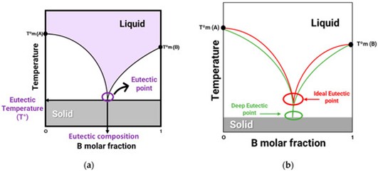 图1. (a) 化合物A和B二元混合物的固-液相图;(b) 典型理想低共熔混合物(红色)与低共熔溶剂(绿色)的相图。