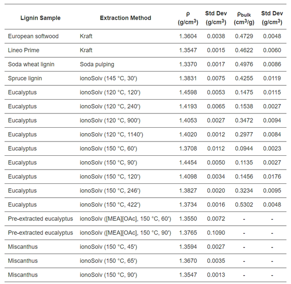 该研究取得了以下核心发现:首先,明确了木质素的密度基本范围:骨架密度分布于1.34–1.46 g/cm³,而体积密度跨度更大(0.09–0.53 g/cm³)。其次,揭示了原料与工艺的明确效应:硬木木质素的骨架密度普遍高于软木;而采用离子液体法提取的木质素,则呈现出独特的高骨架密度、低体积密度特征,暗示其内部具有更发达的孔隙结构。