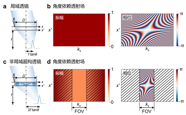 图1:利用非局域超构透镜实现 k 空间超振荡超分辨成像的工作原理。 (a, b) 局域一维柱透镜的示意图及其角度依赖透射场分布。 (c, d) 非局域超构透镜的示意图及其角度依赖透射场分布