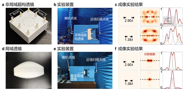 图2:超构透镜的实验表征。 (a, b) 24层聚丙烯非局域超构透镜原型照片及其微波实验测量装置。 (c) 非局域超构透镜对不同间距双点源的成像结果。 (d, e) 对比用的传统局域透镜照片及其测量装置。 (f) 局域透镜对不同间距双点源的成像结果