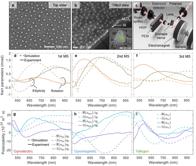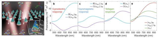 为解决上述问题,研究团队创新性地设计了由钴硅纳米锥构成的共振光学超表面(如图1结构示意)。研究人员利用各向异性使钴部分形成单畴磁态,从而导致自发磁化实现无需外部磁场的稳定特勒根效应。其响应强度比天然材料高出100倍以上,突破了光学频段特勒根效应强度极低且依赖外磁偏置的局限,同时让超表面兼具旋电与旋磁效应,为多效应协同的非互易光学研究提供了全新平台。