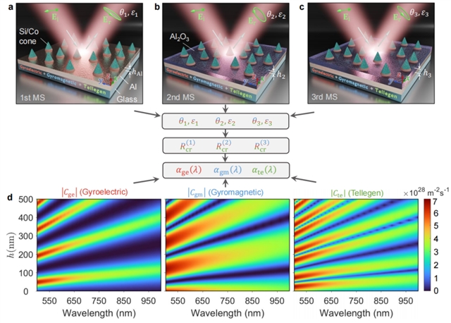 研究团队提出基于三种超表面的单侧照明测量方法(如图2原理展示)。通过制备三种不同氧化铝间隔层厚度的超表面,利用交叉偏振反射系数与三种效应极化率的线性关系,构建线性方程组独立提取特勒根、旋电与旋磁效应的幅值,解决了传统双向照明测量中基板相干性丧失、相位难以精准测量的难题,且无需复杂设备即可完成多非互易效应的分离表征。