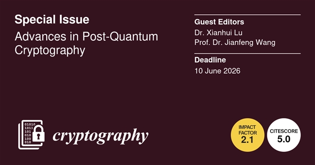 Cryptography邀请了中国科学院信息工程研究所路献辉研究员和西安电子科技大学网络工程学院王剑锋教授,合作建设特刊Advances in Post-Quantum Cryptography (后量子密码学的进展)。本特刊重点关注后量子密码学的最新进展,特刊包括但不限于以下主题: