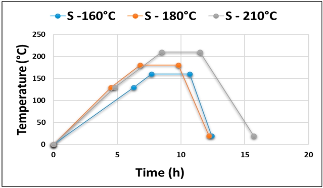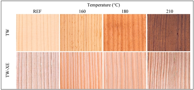 本实验采用捷克中部地区的云杉木材,加工成径向试样,分为四组:一组为未处理对照组(REF),其余三组分别进行160 °C、180 °C和210 °C的Thermowood工艺热处理(记为160-TW、180-TW、210-TW)(图1)。然后将热处理后的试样与对照组一同放入氙灯老化试验箱(Q-SUN Xe-3-HS)进行600小时的湿式加速老化,模拟户外辐射和雨水环境。最后采用多种技术评估木材化学成分、物理性能、纤维形态的变化。