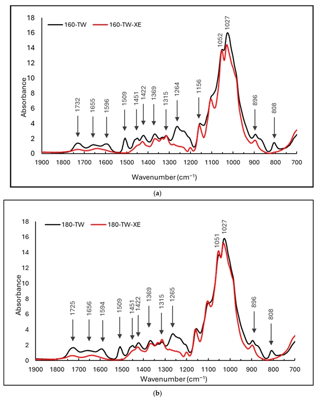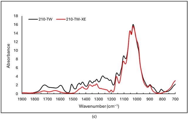 图7.(a)云杉木经160°C热处理(160-TW)和加速老化(160-TW-XE)后的FTIR光谱。(b)云杉木经180°C热处理(180-TW)和加速老化(180-TW-XE)后的FTIR光谱。(c)云杉木经210°C热处理(210-TW)和加速老化(210-TW-XE)后的FTIR光谱。