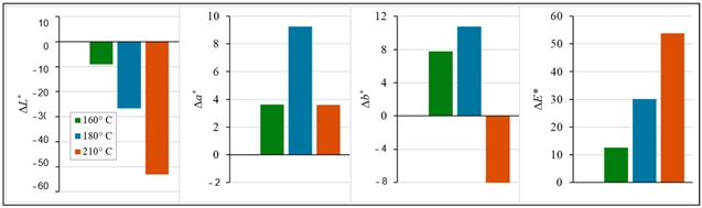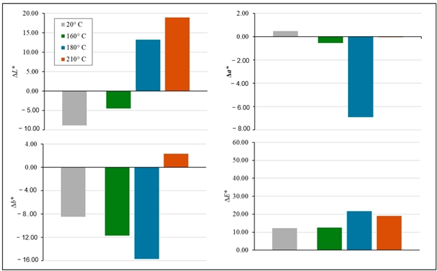 表2.热处理云杉木老化600小时前后颜色坐标 L*、a*和 b* 值的基本统计特征。