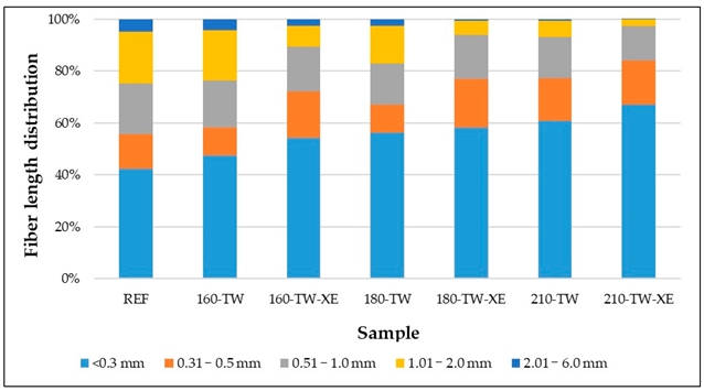 图8.云杉木样品的纤维长度分布取决于其处理方式。