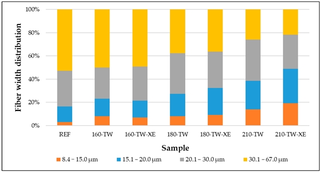 图9.云杉木样品的纤维宽度分布取决于其处理方式。