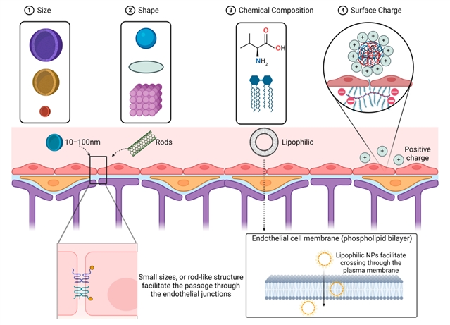 图1. 纳米粒子的尺寸、形状、化学成分和表面电荷是影响纳米粒子穿透血脑屏障能力的四个主要因素。具有棒状结构的小NPs、亲脂性NPs和带正电荷的NPs具有更高的穿越血脑屏障内皮连接的能力。