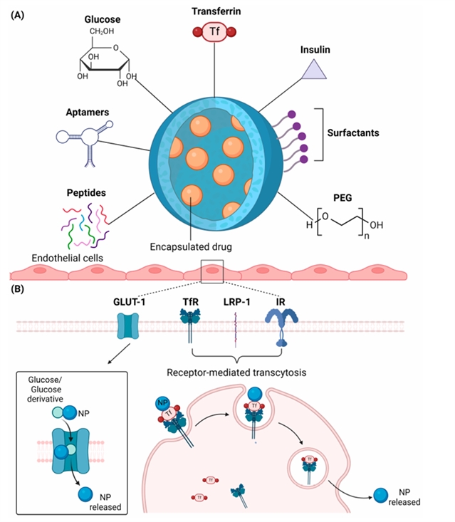 图2. NP表面修饰及NP通过内皮细胞转运的机制。(A)用于NPs的配体和化学基团包括葡萄糖、转铁蛋白、胰岛素、适体、肽、聚乙二醇(PEG)和表面活性剂。这些表面功能化基团促进NPs通过血脑界面进入并被大脑摄取。(B)具有配体和化学基团的NP可被葡萄糖转运蛋白(GLUT-1)、转铁蛋白受体(TfR)、低密度脂蛋白受体相关蛋白1 (LRP-1)受体和胰岛素受体(IR)等细胞表面受体识别,通过不同的机制促进NP跨细胞转运。