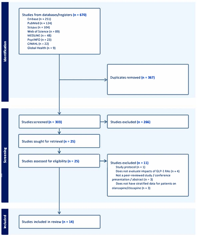 经过筛选,共有14项研究被纳入分析。这些研究包括随机对照试验、病例报告、病例系列以及观察性研究等不同类型。总体来看,纳入研究共涉及139名同时接受GLP-1受体激动剂与抗精神病药治疗的患者,随访时间从16周到2年不等。