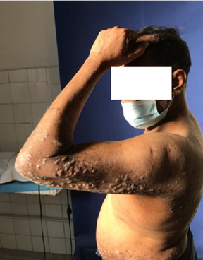 皮肤增厚、苔藓化,伴抓痕 |