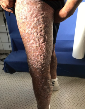 紫红色疣状斑块,好发于下肢 |