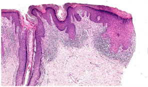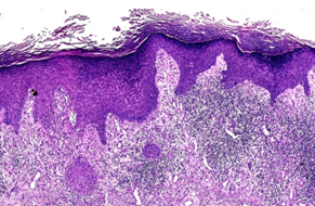 患者为60岁男性,全身广泛分布瘙痒性疣状斑块,持续一年。初起于右踝,逐渐蔓延至四肢及躯干。病理检查显示:表皮角化过度、颗粒层增厚、棘层不规则增生,真皮乳头层可见致密带状淋巴细胞浸润。