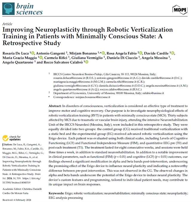 De Luca, R.; Gangemi, A.; Bonanno, M.; Fabio, R.A.; Cardile, D.; Maggio, M.G.; Rifici, C.; Vermiglio, G.; Di Ciuccio, D.; Messina, A.; et al. Improving Neuroplasticity through Robotic Verticalization Training in Patients with Minimally Conscious State: A Retrospective Study. Brain Sci. 2024, 14, 319.
