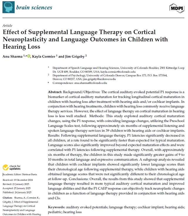 Sharma, A.; Cormier, K.; Grigsby, J. Effect of Supplemental Language Therapy on Cortical Neuroplasticity and Language Outcomes in Children with Hearing Loss. Brain Sci. 2025, 15, 119.