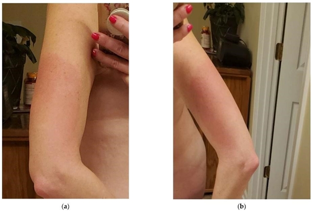 本病例患者为一名50岁女性,患有克罗恩病史,并因运动损伤引发右膝疼痛,2022年10月在初级保健诊所接种了重组带状疱疹疫苗。在左三角肌接种重组带状疱疹疫苗数小时后,患者出现了全身性类流感症状,包括发烧、全身肌肉痛和关节痛,以及被描述为“比剧烈运动更严重的疼痛”的疲劳。注射后的第二天(第2天),患者出现恶心和食欲减退,同时首次出现双臂及左前大腿(左侧>右侧)的刺痛感和灼烧感。左三角肌注射部位明显肿大、发热且出现红斑,这些症状持续了大约两周才完全缓解。第三天,她的发烧、恶心/食欲减退、肌痛和疲劳都缓解了;但她仍有持续的疼痛,描述为双侧关节(包括肘部、脚踝和膝盖)剧烈的“酸痛”,并且这些受影响的关节有明显肿胀。
