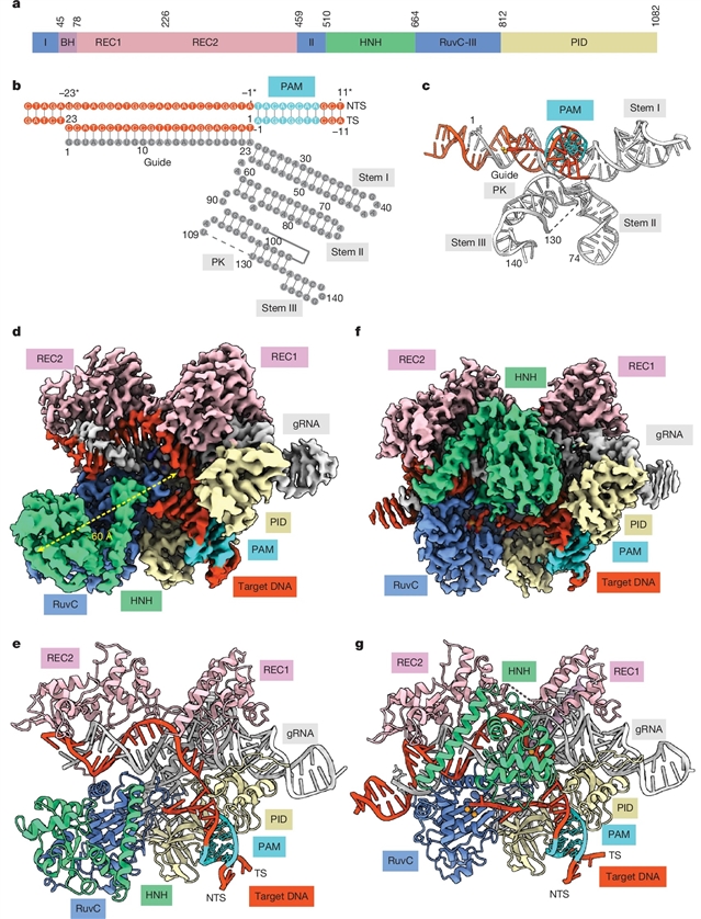 Abstract: The bacterial CRISPR–Cas9 (Cas9) nuclease has become a powerful genome manipulation tool for a wide range of organisms1,2,3. However, it has yet to fully leverage the pervasive presence of DNA methylation in genomes4,5,6,7,8,9,10. Here, to fill this gap, we report biochemical, structural and human genome-editing characterizations of a methylation-sensitive Cas9 (ThermoCas9). ThermoCas9 efficiently binds to and cleaves DNA upstream of its protospacer adjacent motif (PAM) 5′-NNNNCGA-3′ or 5′-NNNNCCA-3′ in vitro. Methylation of the fifth cytosine in either PAM sequence (5mCpG or 5mCpC), however, significantly inhibits ThermoCas9 activity. Cryo-electron microscopy structures of ThermoCas9 in pre-cleavage and post-cleavage states at 2.8 and 2.2 resolution, respectively, reveal the molecular basis for the stringent requirement of the unmethylated cytosine in PAM binding and provide guidance for further enzyme engineering. We demonstrate methylation-sensitive editing by ThermoCas9 in human cell lines with distinct DNA methylation landscapes. Moreover, we demonstrate that a catalytically enhanced ThermoCas9 efficiently targets luminal expression signature genes that are consistently hypomethylated in patients with breast cancer. Owing to its sensitivity to DNA methylation, ThermoCas9 can specifically target cells with disease-related hypomethylation, which adds another layer of precision to genome-editing technologies.