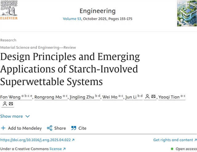 Engineering最新综述提出淀粉基特殊润湿性系统的设计原则,助力先进功能材料的可持续发展 |