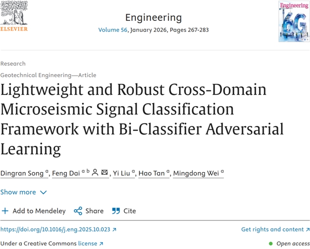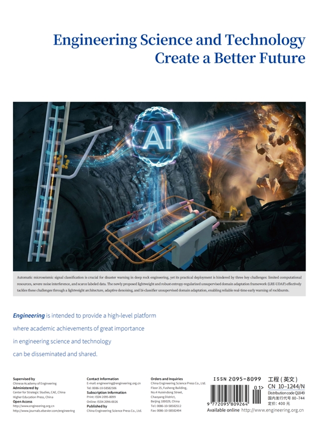 近日,四川大学山区河流保护与治理全国重点实验室戴峰教授团队在Engineering发表了题为 “Lightweight and Robust Cross-Domain Microseismic Signal Classification Framework with Bi-Classifier Adversarial Learning” 的研究论文,并被遴选为该期刊2026年1月刊封底文章。四川大学山区河流保护与治理全国重点实验室为论文第一单位,戴峰教授为通讯作者,水利水电学院2022级博士研究生宋丁然为论文第一作者。