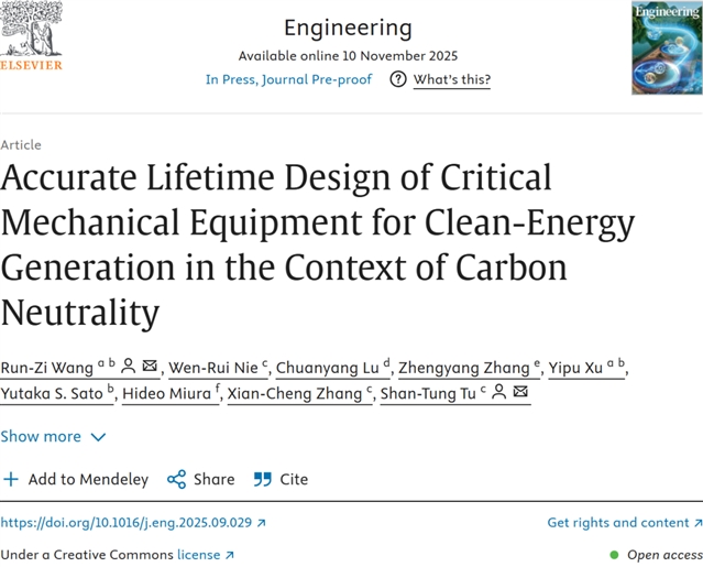 涂善东教授领衔的华东理工大学—日本东北大学联合研究团队,近日在中国工程院院刊《Engineering》发表了题为“Accurate Lifetime Design of Critical Mechanical Equipment for Clean-Energy Generation in the Context of Carbon Neutrality”(碳中和背景下清洁能源重大机械装备的精准寿命设计方法)的研究论文,第一作者为王润梓博士,涂善东教授为通讯作者。论文聚焦于清洁能源关键机械装备的精准寿命设计技术,特别是面向碳中和背景的损伤驱动寿命设计方法在高温结构完整性中的应用。