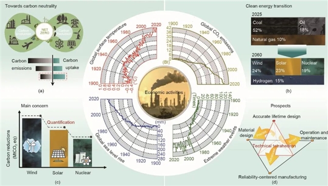 图 1. 全球气候变化背景下清洁能源系统面临的主要问题:(a) 碳中和的背景与总体目标,(b) 中国能源结构演进的目标取向,(c) 碳减排量化的核心关注点,(d)结构完整性全链条技术。