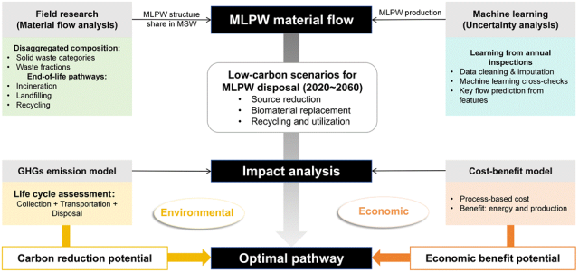管理城市生活塑料垃圾(MLPW)在收集、回收和处理环节面临着复杂的系统级挑战,需要同时兼顾资源循环、环境减排和经济效益等多重目标。然而,在实际管理中,稳健的评估往往受阻于底层数据匮乏和测量不准确,这极大地削弱了评估模型在地方决策中的可靠性与可迁移性。为了克服这些局限,东南大学曹世杰教授团队提出了一种人工智能(AI)增强的评估框架,旨在为城市规模的MLPW精细化管理提供关键的数据支撑,并探索优化其低碳与经济双重绩效的最佳实施路径。